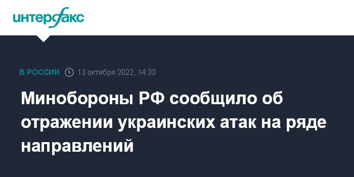Москва. 13 октября. INTERFAX.RU - Российские военные отразили попытки подразделений армии Украины атаковать на Купянском, Краснолиманском и Николаево-Криворожском направлениях, сообщили в четверг в Минобороны РФ.