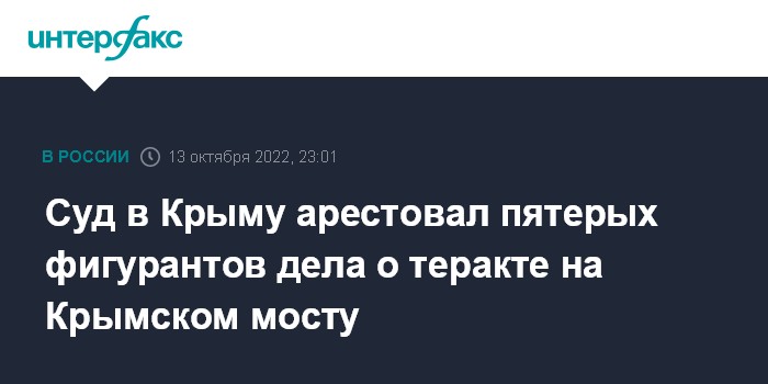 Москва. 13 октября. INTERFAX.RU - Киевский районный суд Симферополя по ходатайству следствия отправил под арест пятерых фигурантов уголовного дела о взрыве на Крымском мосту, сообщил "Интерфаксу" осведомленный источник.