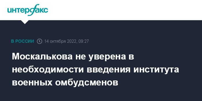 Москва. 14 октября. INTERFAX.RU - Институт уполномоченных по правам человека уже защищает права военнослужащих совместно с Министерством обороны, этот опыт можно совершенствовать вместо создания новых структур, заявила российский омбудсмен Татьяна Москалькова, комментируя законопроект о создании института военных омбудсменов.