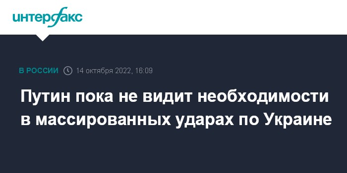 Москва. 14 октября. INTERFAX.RU - Необходимости в массированных ударах по Украине в настоящее время нет, заявил на пресс-конференции президент Владимир Путин.