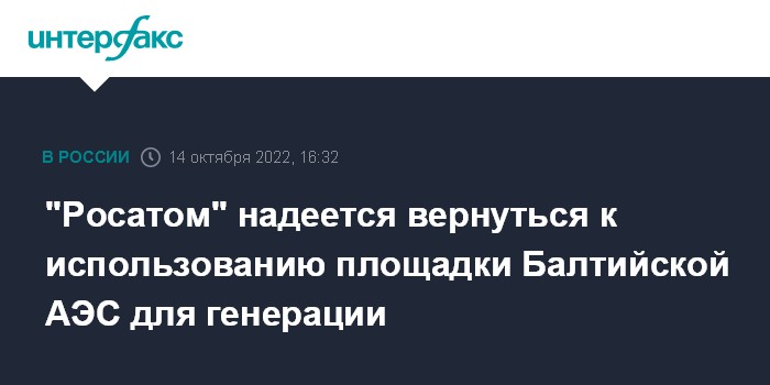 Москва. 14 октября. INTERFAX.RU - Госкорпорация "Росатом" рассчитывает "рано или поздно" вернуться к использованию площадки Балтийской АЭС для энергетики, возможно, для малой АЭС, сообщил журналистам глава компании Алексей Лихачев.