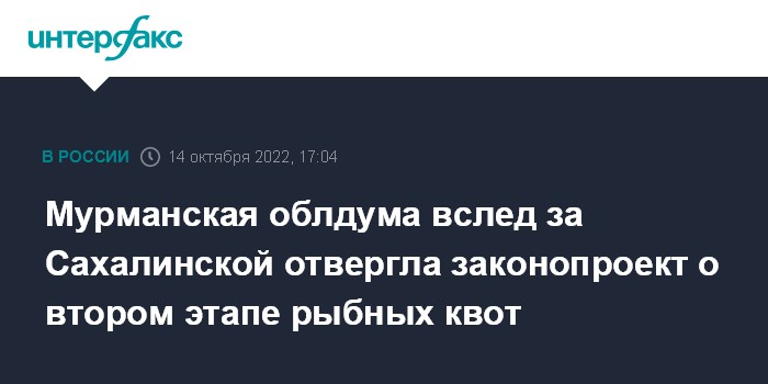 Москва. 14 октября. INTERFAX.RU - Мурманская областная дума дала отрицательное заключение на федеральный законопроект по реализации второго этапа инвестиционных квот на вылов водных биологических ресурсов (ВБР), передал корреспондент "Интерфакса". Депутаты подержали этот отзыв единогласно.
