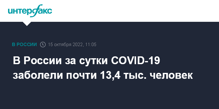 Москва. 15 октября. INTERFAX.RU - Суточный прирост новых заболевших коронавирусной инфекцией в РФ составил 13 384 случая, следует из данных оперативного штаба, обнародованных в субботу.