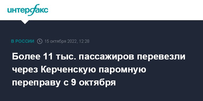Москва. 15 октября. INTERFAX.RU - Керченской паромной переправой с 9 октября воспользовались свыше 11 тыс. человек, сообщил в субботу Минтранс РФ.