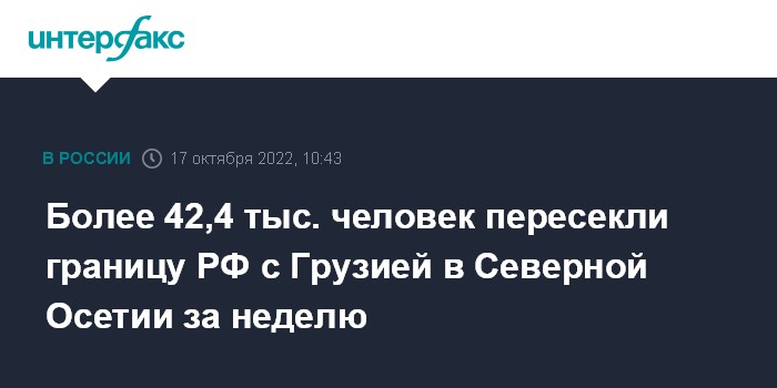 Москва. 17 октября. INTERFAX.RU - За прошедшую неделю российско-грузинскую границу через пункт пропуска "Верхний Ларс" в Северной Осетии в обоих направлениях пересекли 42,4 тыс. человек, сообщил первый заместитель председателя правительства республики Мурат Агузаров.