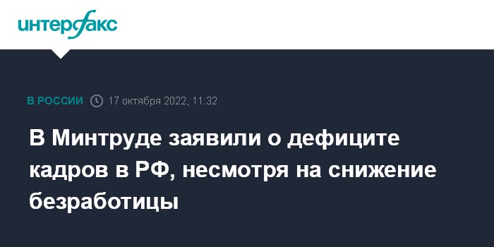 Москва. 17 октября. INTERFAX.RU - Замглавы Минтруда РФ Елена Мухтиярова заявила, что российские работодатели испытывают нехватку в кадрах, при этом безработица находится на минимальном уровне.