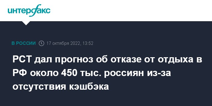 РСТ дал прогноз об отказе от отдыха в РФ около 450 тыс. россиян из-за отсутствия кэшбэка