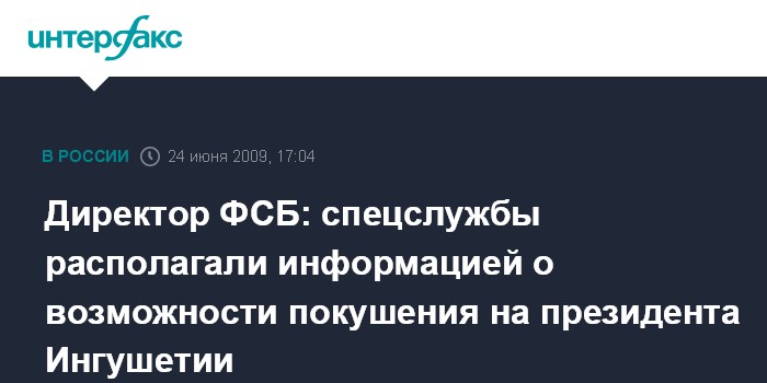 Москва. 24 июня. INTERFAX.RU - ФСБ России располагало информацией о возможности покушения на президента Ингушетии, сообщил директор ФСБ России Александр Бортников.