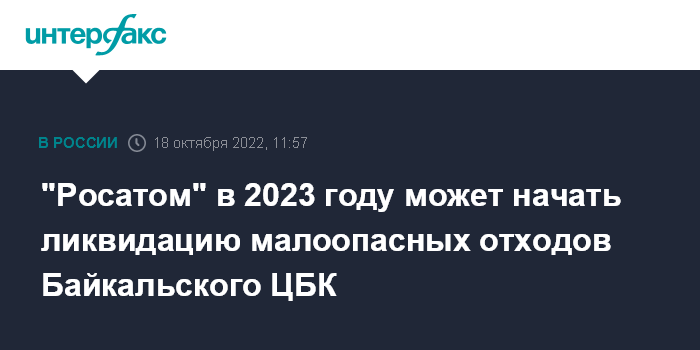 Москва. 18 октября. INTERFAX.RU - "Росатом" рассчитывает в 2023 году приступить к ликвидации малоопасных отходов закрытого Байкальского ЦБК, сообщил директор направления по реализации государственных и отраслевых программ в сфере экологии "Росатома" Андрей Лебедев.