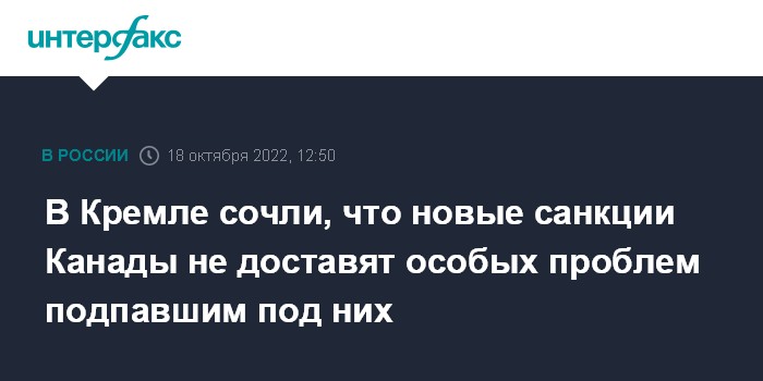 Москва. 18 октября. INTERFAX.RU - В Кремле заявили, что новая серия санкций со стороны Канады в отношении группы российских политиков и журналистов никаких особых проблем или дискомфорта этим людям не доставит.