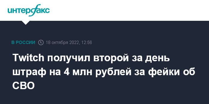 Москва. 18 октября. INTERFAX.RU - Мировой суд Таганского района Москвы назначил второй за день административный штраф видеостриминговому сервису Twitch за неудаление ложной информации - видео и текстов - о ходе российской спецоперации на Украине, передает корреспондент "Интерфакса".