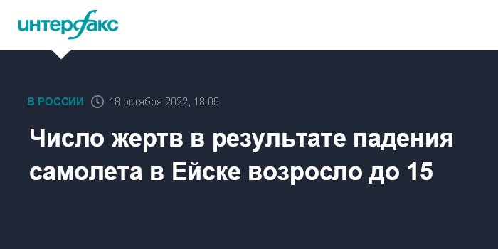 Москва. 18 октября. INTERFAX.RU - Количество погибших в результате падения военного самолета на жилой дом в Ейске выросло до 15, сообщила "Интерфаксу" замгубернатора Краснодарского края Анна Минькова.