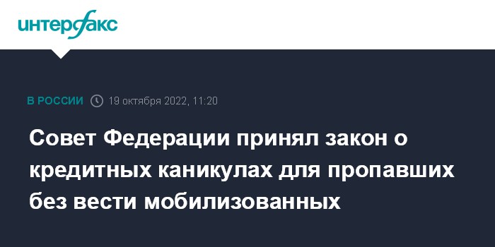 Москва. 19 октября. INTERFAX.RU - Совет Федерации одобрил закон о продлении кредитных каникул мобилизованных граждан. Они будут продлеваться до того момента, пока суд не объявит заемщика умерших. Также закон вводит предельные лимиты по кредитам для погибших предпринимателей.