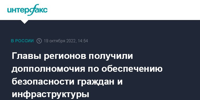 Москва. 19 октября. INTERFAX.RU - Президент РФ Владимир Путин наделил глав регионов страны дополнительными полномочиями для принятия мер по обеспечению безопасности граждан, а также антитеррористической защищенности объектов критической инфраструктуры.