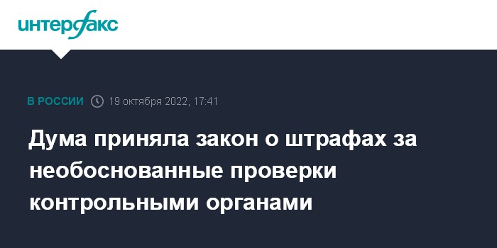 Москва. 19 октября. INTERFAX.RU - Госдума РФ приняла закон, которым в Кодекс об административной ответственности (КоАП) РФ вносятся изменения, предусматривающие введение административной ответственности в виде штрафа за проведение контрольными органами необоснованных проверок.
