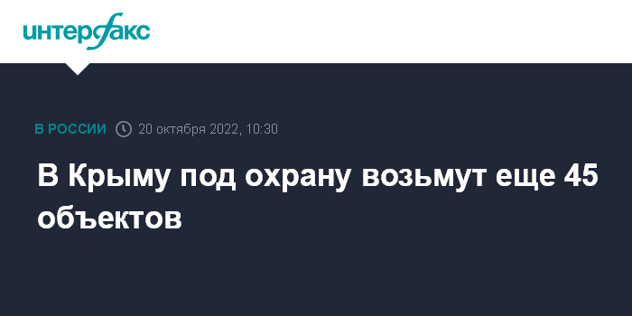 Москва. 20 октября. INTERFAX.RU - В связи со введением режима среднего уровня реагирования в Крыму возьмут под охрану еще около 45 объектов, сообщил телеканалу "Россия 24" глава региона Сергей Аксенов.