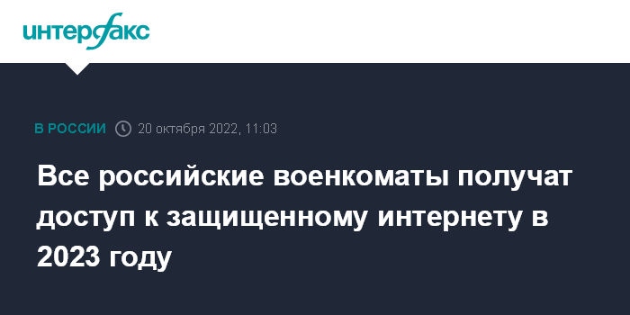 Москва. 20 октября. INTERFAX.RU - Все военкоматы России будут обеспечены доступом к защищенному интернету и к сети Минобороны в 2023 году, сообщил глава Минцифры Максут Шадаев.