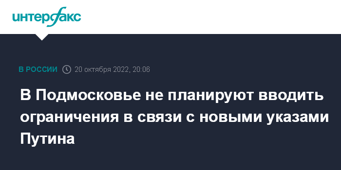 Москва. 20 октября. INTERFAX.RU - Ограничения на региональном уровне не планируют вводить в Московской области в связи с новыми указами президента страны Владимира Путина о введении в регионах ЦФО уровня повышенной готовности.