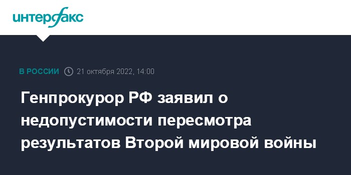 Москва. 21 октября. INTERFAX.RU - Генеральный прокурор России Игорь Краснов заявил о недопустимости пересмотра итогов Второй мировой войны и фальсификации роли СССР в победе над нацизмом.