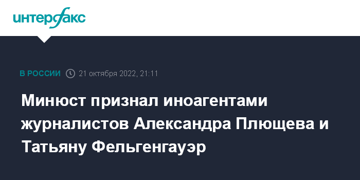 Москва. 21 октября. INTERFAX.RU - Минюст внес в перечень физлиц, выполняющих функции иностранного агента, восемь человек, среди которых журналисты "Эха Москвы" Александр Плющев и Татьяна Фельгенгауэр (Шадрину). Всем восьмерым вменяется осуществление политической деятельности и наличие иностранного финансирование.