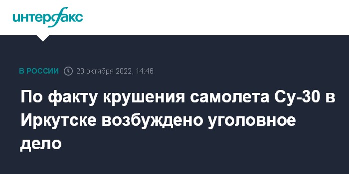 Москва. 23 октября. INTERFAX.RU - Дело о нарушении правил безопасности эксплуатации воздушного транспорта возбуждено после крушения военного самолета авиапредприятия в Иркутске, сообщает телеграм-канал Следственного комитета РФ (СКР).