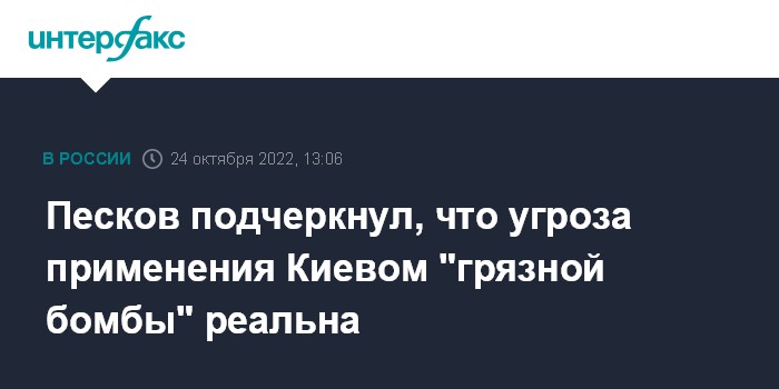 Москва. 24 октября. INTERFAX.RU - В Кремле заявили, что угроза применения Киевом "грязной бомбы" реальна, и дело США, Великобритании и Франции верить в нее или нет.