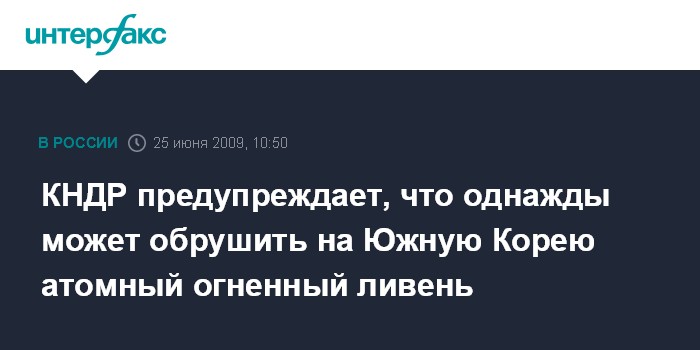 Москва. 25 июня. INTERFAX.RU - Предложение США взять Южную Корею под свой "ядерный зонтик" дает полное право КНДР разрабатывать собственную ядерную программу, говорится в статье, опубликованной в северокорейской газете "Нодон синмун". Выдержки из этого материала публикуют в четверг южнокорейские СМИ.