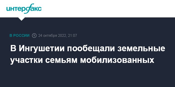 Москва. 24 октября. INTERFAX.RU - Семьи мобилизованных из Ингушетии могут рассчитывать на получение земельного участка под ИЖС, заявил глава региона Махмуд-Али Калиматов.