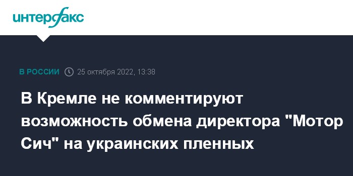 Москва. 25 октября. INTERFAX.RU - В Кремле заявили, что не занимаются вопросами обмена пленными, так ответив на просьбу журналистов прокомментировать возможность обмена арестованного директора запорожского завода "Мотор Сич" Вячеслава Богуслаева на украинских военнопленных.