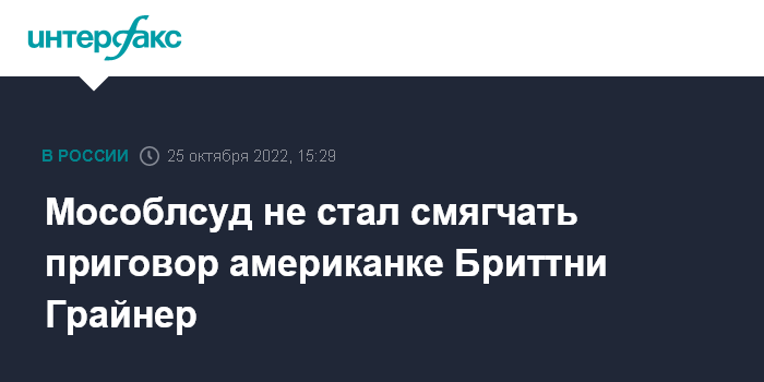 Москва. 25 октября. INTERFAX.RU - Московский областной суд не стал смягчать приговор американской баскетболистке Бриттни Грайнер, которую ранее приговорили к девяти годам колонии и штрафу в 1 млн рублей за ввоз гашишного масла в Россию.