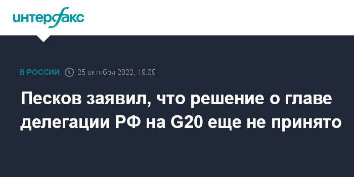 Москва. 25 октября. INTERFAX.RU - Решение о том, кто возглавит российскую делегацию на саммите "двадцатки" в Индонезии, пока не принято, заявил пресс-секретарь президента РФ Дмитрий Песков.