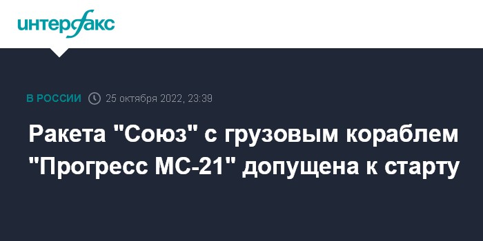 "25 октября 2022 года на космодроме Байконур Госкомиссия одобрила заправку ракеты-носителя "Союз-2.1а" с грузовиком "Прогресс МС-21" и ее пуск 26 октября в 03:20:09 мск", - говорится в сообщении госкорпорации в телеграм-канале.