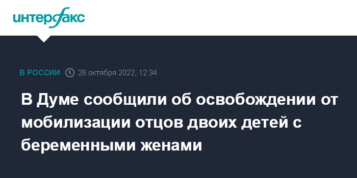 Москва. 26 октября. INTERFAX.RU - Минобороны освободит от частичной мобилизации отцов двоих детей, ожидающих появления третьего ребенка, сообщила в Telegram председатель комитета Госдумы по вопросам семьи, женщин и детей Нина Останина.