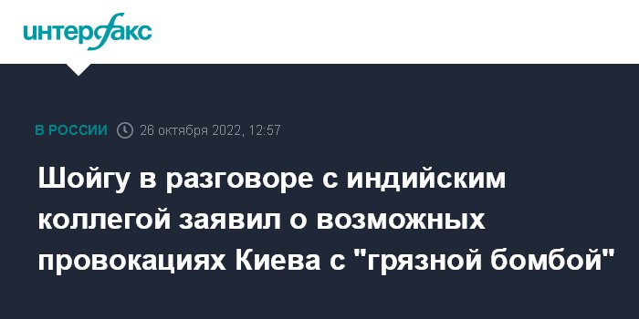 Москва. 26 октября. INTERFAX.RU - Министр обороны РФ Сергей Шойгу в ходе телефонных переговоров с главой военного ведомства Индии выразил озабоченность по поводу возможных провокаций со стороны Киева с применением "грязной бомбы", сообщило Минобороны РФ в среду.