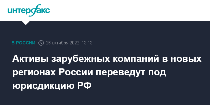 Москва. 26 октября. INTERFAX.RU - В Кремле подтвердили, что планируется перевести в российскую юрисдикцию активы зарубежных компаний на вновь присоединенных территориях.