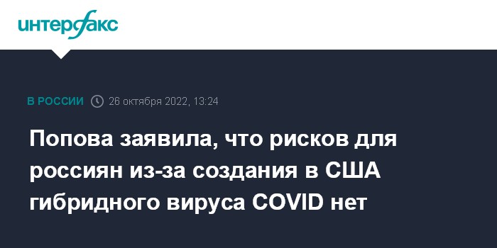 Москва. 26 октября. INTERFAX.RU - Рисков для россиян в связи с созданием учеными в США более смертельного варианта коронавируса нет, сообщила глава Роспотребнадзора Анна Попова.