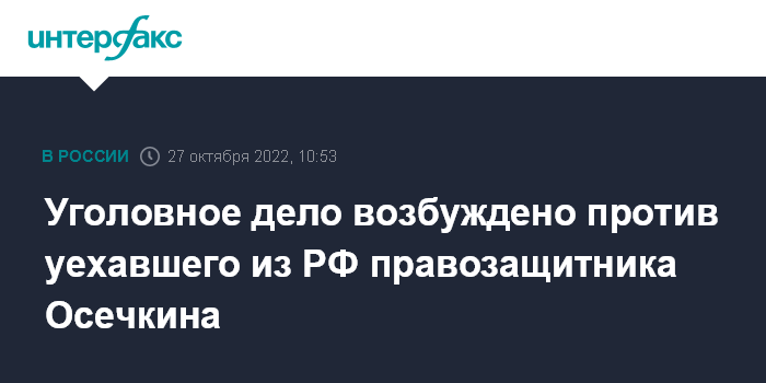 Москва. 27 октября. INTERFAX.RU - Уехавший из РФ правозащитник Владимир Осечкин стал фигурантом уголовного дела о распространении дезинформации о действиях российской армии. Об этом сообщила официальный представитель столичного главка следственного комитета (СК) Юлия Иванова