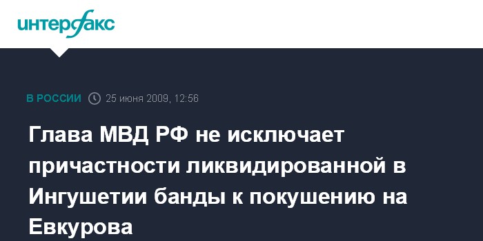 Москва. 25 июня. INTERFAX.RU - Уничтоженная накануне банда Алиева могла иметь отношение к покушению на президента Ингушетии Юнус-Бека Евкурова, заявил журналистам в Махачкале в четверг министр внутренних дел РФ Рашид Нургалиев. Как заявил Нургалиев, отвечая на вопрос о ходе расследования покушения на Евкурова, буквально вчера была проведена операция, и основной бандлидер по фамилии Алиев был уничтожен. Он имел непосредственное отношение к убийству сотрудников правоохранительных органов, гражданских лиц, а банда, которой он руководил, в том числе имеет отношение к возможным вопросам, о которых вы говорите.