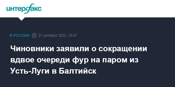Москва. 27 октября. INTERFAX.RU - Очередь из грузовиков на перевозку паромной линией Усть-Луга - Балтийск сокращена в два раза в сравнении с началом октября, сообщила в эфире ГТРК "Калининград" министр развития инфраструктуры Калининградской области Евгения Кукушкина.