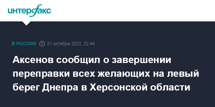 Москва. 27 октября. INTERFAX.RU - Глава Крыма Сергей Аксенов сообщил о завершении переправки всех желающих на левый берег Днепра в Херсонской области, он посетил переправу вместе с первым заместителем руководителя администрации президента Сергеем Кириенко.