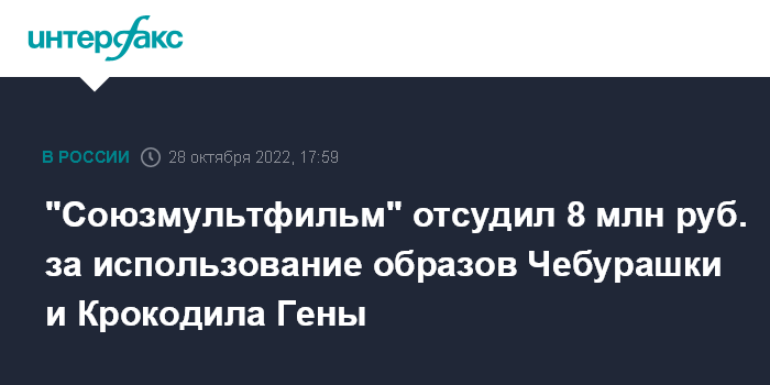 Москва. 28 октября. INTERFAX.RU - Арбитражный суд Москвы взыскал 8 млн рублей в пользу кинокомпании "Союзмультфильм" за незаконное использование образов Чебурашки и Крокодила Гены в символике ресторана "Тебурасика", сообщили "Интерфаксу" в пресс-службе студии.