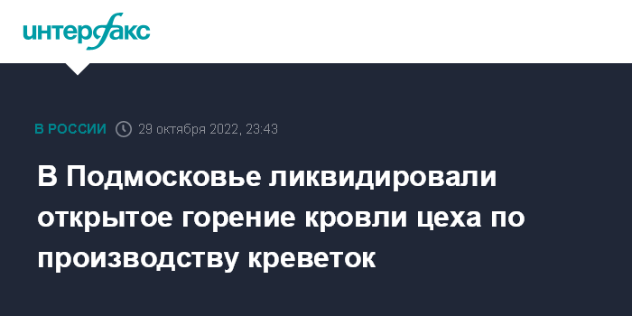 Москва. 29 октября. INTERFAX.RU - Пожарные ликвидировали открытое горение кровли цеха по производству креветок в подмосковном Дмитрове. Они объявили об этом в 22:15.