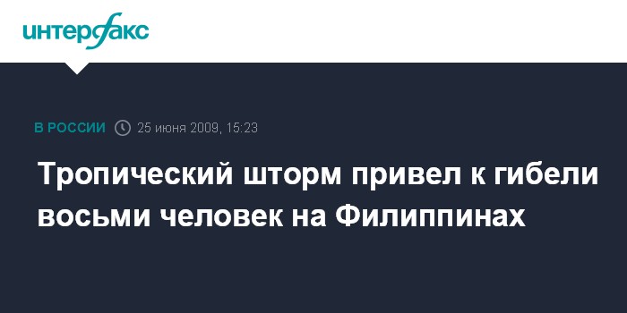 Вашингтон. 25 июня. INTERFAX.RU - Сильный тропический шторм, обрушившийся на Филиппины, привел к гибели минимум восьми человек, передает CNN. Еще 11 человек пропали без вести.