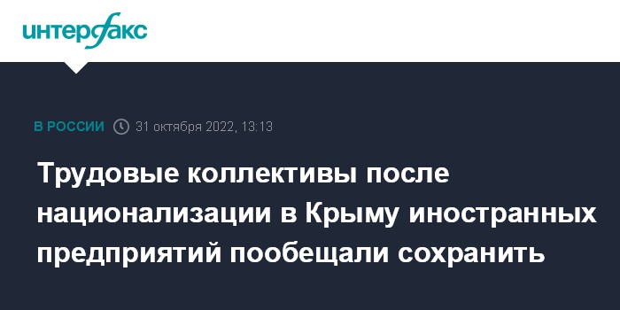 Москва. 31 октября. INTERFAX.RU - Глава Крыма Сергей Аксенов пообещал сохранить трудовые коллективы предприятий, которые будут национализированы в рамках принятой в республике процедуры изъятия собственности иностранных граждан и недружественных государств.