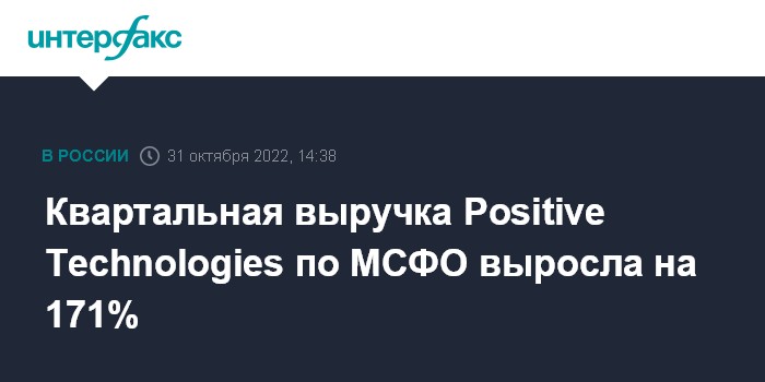 Москва. 31 октября. INTERFAX.RU - В III квартале 2022 года выручка по МСФО российского разработчика решений в области информационной безопасности Positive Technologies составила 3,5 млрд рублей, что на 171% больше, чем годом ранее, сообщила компания.
