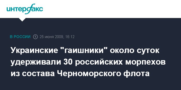 Москва. 25 июня. INTERFAX.RU - Украинские милиционеры около суток удерживали на автодороге в Крыму подразделение морских пехотинцев Черноморского флота, сообщили "Интерфаксу-АВН" в четверг в штабе ЧФ. Как сообщил собеседник агентства, тридцать морских пехотинцев на служебном автобусе ПАЗ, принадлежащем автопарку Черноморского флота, были остановлены сотрудниками украинского ГАИ 23 июня на въезде в Феодосию. Автомобиль следовал в район горы Опук к месту обучения морпехов. Милиционеры начали проверку российских военнослужащих, которая продолжалась в общей сложности около 20 часов.