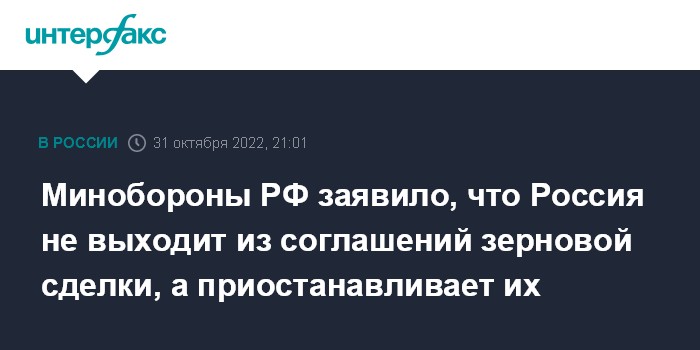 Москва. 31 октября. INTERFAX.RU - РФ не выходит из соглашений по вывозу зерна из портов Украины, Москве нужны гарантии, что коридор в Черном море не будет использоваться Киевом для боевых действий, заявили в Минобороны РФ.