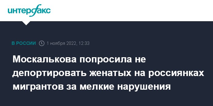 "Нередко депортации подлежат мигранты, которые здесь создали с нашими женщинами семьи. И сегодня административный кодекс очень жестко ставит вопрос, что человек, совершивший дважды административное правонарушение, подлежит административному штрафу и выдворению. И мы бы просили законодателя, чтобы он альтернативу посмотрел", - сказала Москалькова .