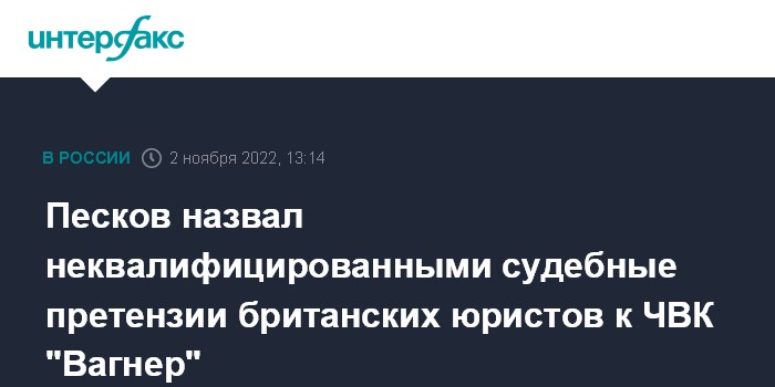 На просьбу журналистов прокомментировать намерения одной из британских юридических компаний подать иск против группы "Вагнер" из-за ее действий на Украине, пресс-секретарь президента РФ Дмитрий Песков сказал: "Во-первых, мы не можем ничего говорить о деятельности компании, это частная (компания). А второе – судя по формулировкам, которые вы процитировали, это крайне неквалифицированная постановка вопроса".