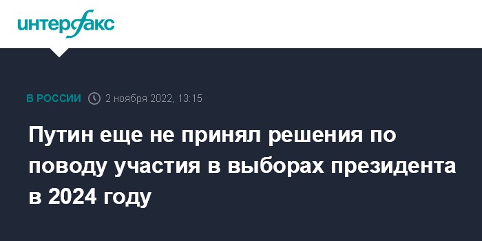 Москва. 2 ноября. INTERFAX.RU - Президент РФ Владимир Путин еще не принимал решения вновь выдвигаться на пост главы государства в 2024 году, заявил его пресс-секретарь Дмитрий Песков.